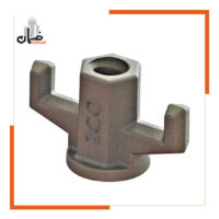 - مهره خروسکی (Wing Nut): این مهره به دلیل داشتن دو باله (شبیه به بال های خروس)، به راحتی و با سرعت با دست یا چکش سفت و باز میشود. جنس آن از چدن داکتیل (نشکن) است تا بتواند نیروی کششی بالای بولت را بدون شکستن تحمل کند.